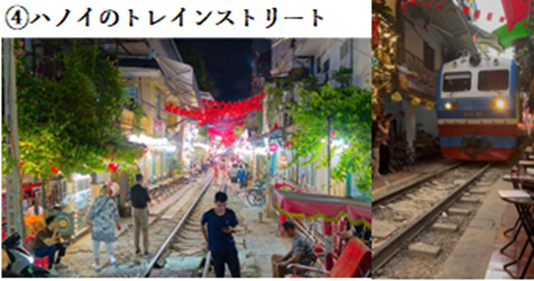 - ハノイのトレインストリート(大迫力でインスタ映え間違え無し。飲んだ後の瓶ビールの蓋を電車に踏ませてお土産に)