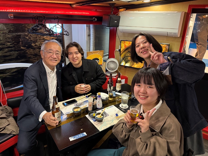 夜は屋形船「平井」夕食懇親会がありました。屋形船も初めての体験で船の中から見る夜景はとても綺麗でした。食事もとても美味しく忘れられない体験になりました。