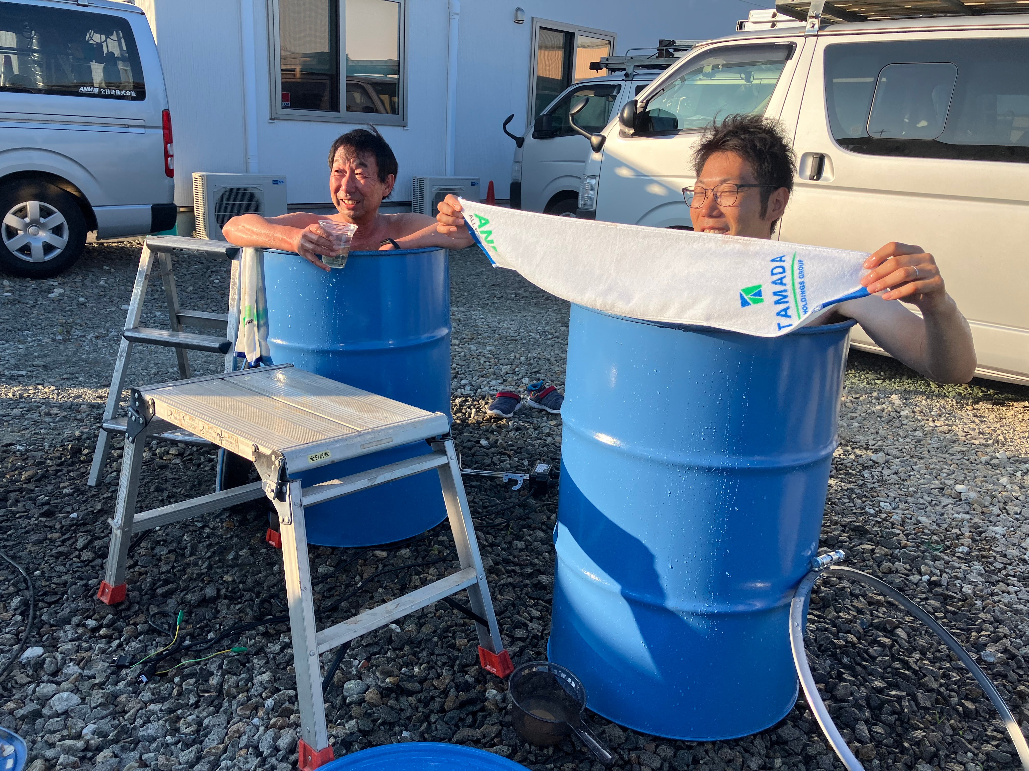 五右衛門風呂は電気ヒーターで加温し、温泉の素とドラム缶のサビで身も心も温まりました。